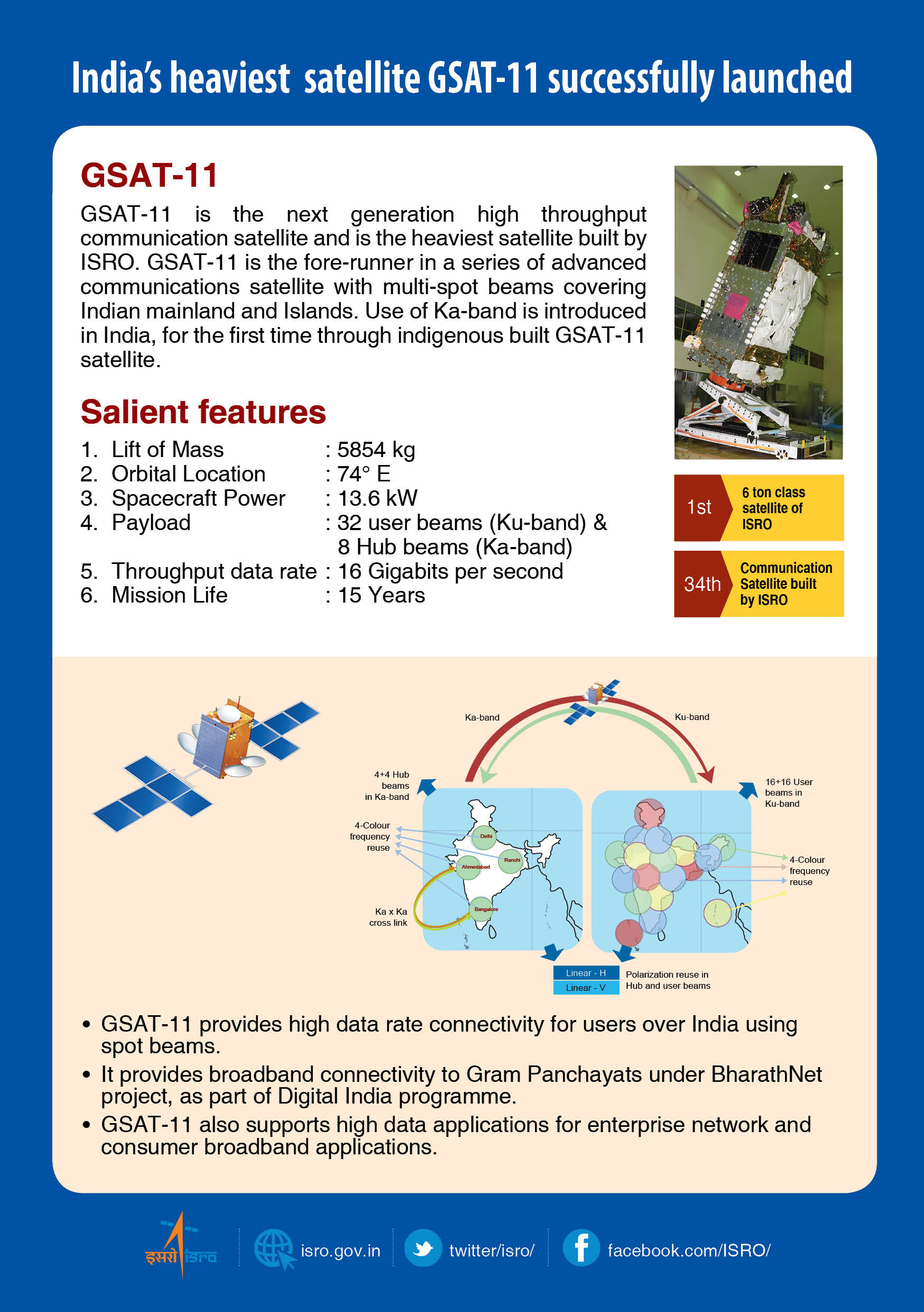 The 5854-kg GSAT-11 will provide high data rate connectivity to users of Indian mainland and islands through 32 user beams in Ku-band and 8 hub beams in Ka-band.