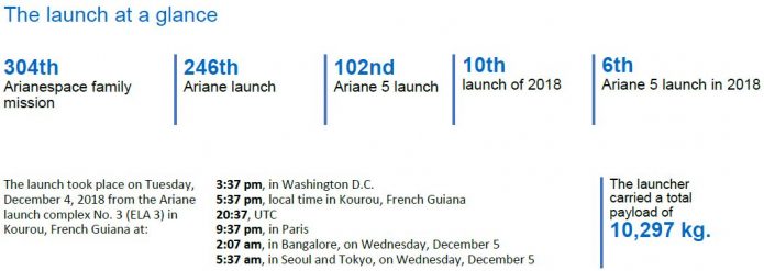 The mission was Arianespace of Evry, France's sixth Ariane 5 mission of the year and 10th cumulative launch for 2018.
