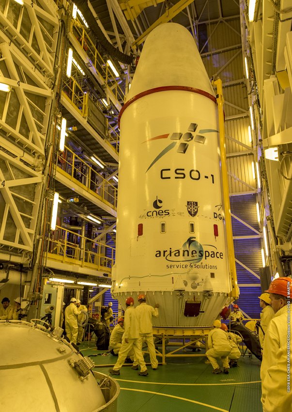 Soyuz has been cleared for Arianespace's December 18 liftoff with CSO-1, which is contained in the "upper composite" – shown here after integration atop the launch vehicle in French Guiana.