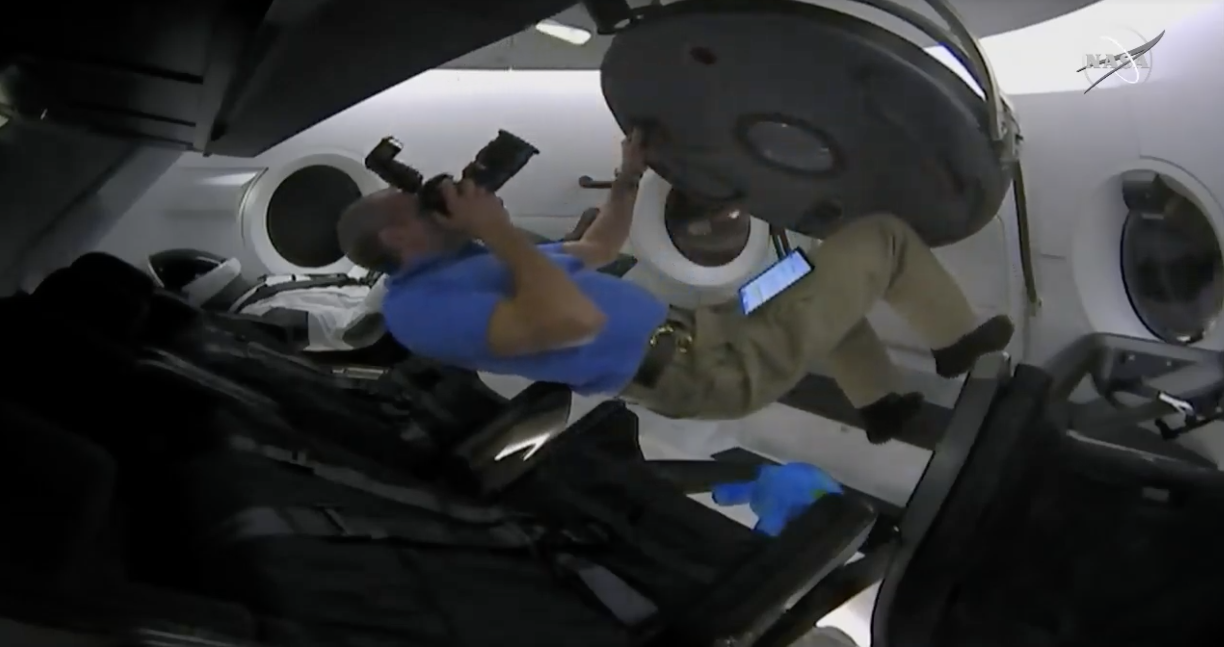 Люк в корабль был открыт Сен-Жаком в 16.07 мск. После этого Сен-Жак и Кононенко вошли в Dragon-2 и взяли пробы воздуха.