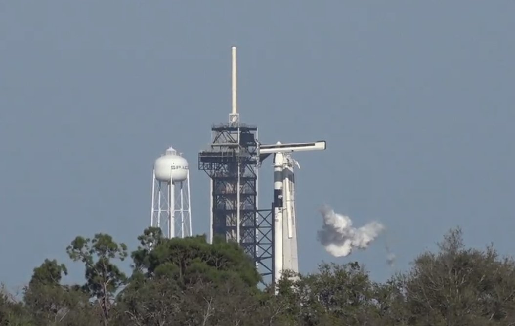 The first vapors are visible venting from the Falcon 9 rocket at pad 39A as fueling is underway in preparation for a test-firing with the Crew Dragon spacecraft at 4 p.m. EST (2100 GMT).