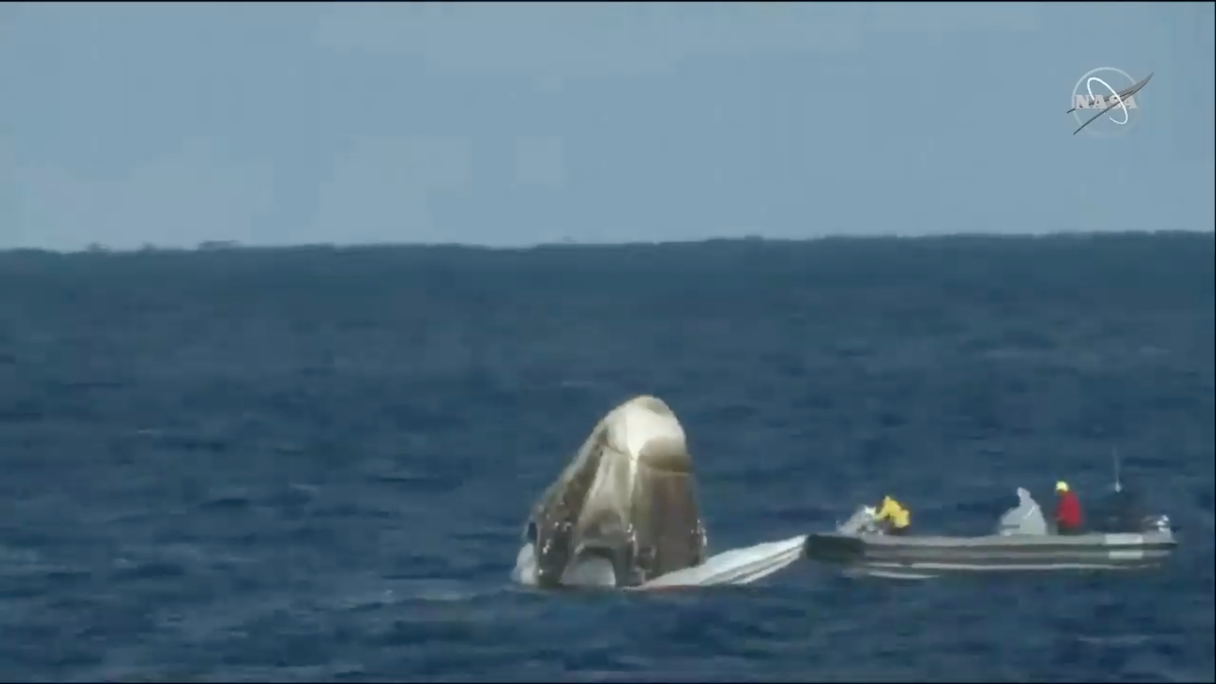 The recovery team has reached the Crew Dragon spacecraft and pulled one of the four parachutes off the capsule. The chutes were expected to detach after splashdown.
