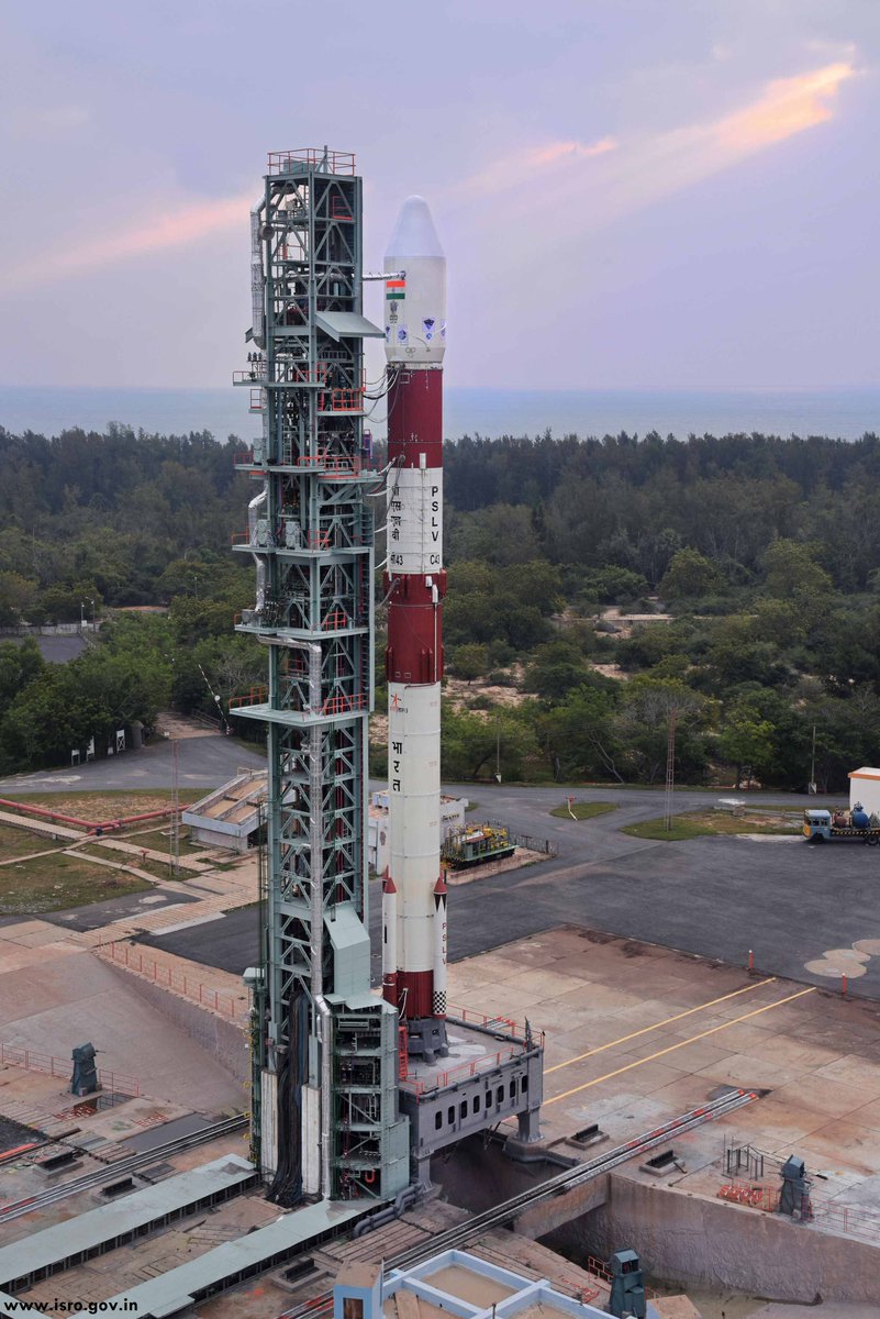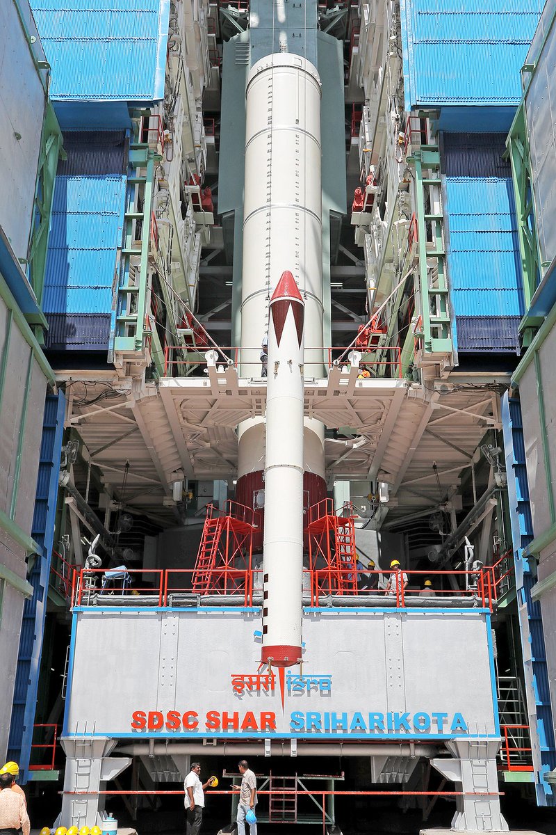 The Polar Satellite Launch Vehicle is standing on the First Launch Pad at the Satish Dhawan Space Center on India's southeastern coast, ready for liftoff on a nearly two-hour mission to deploy the 31 payloads at two different altitudes.