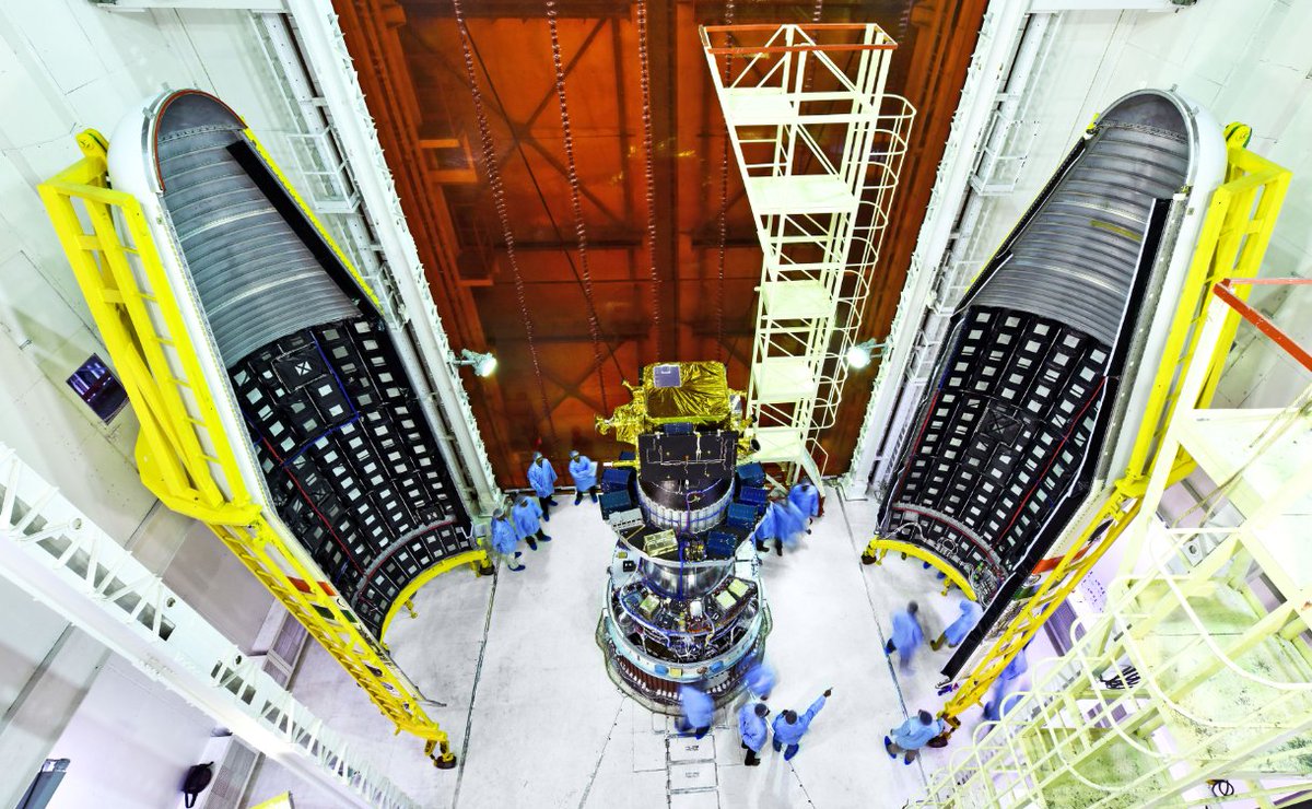 The rocket's clamshell-like payload shroud is scheduled to peel away during the second stage burn, as the Vikas engine produces about 180,000 pounds of thrust.