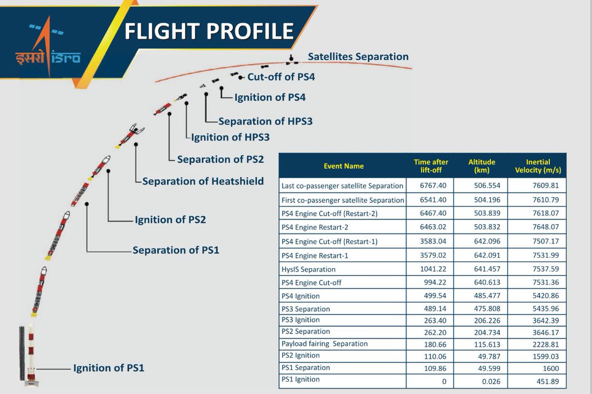But the mission isn't over at that point. Two more firings of the PSLV fourth stage are planned at T+plus 59 minutes, 39 seconds, and at T+plus 1 hour, 47 minutes, 43 seconds, to maneuver the rocket and the remaining satellites into a lower 313-mile-high (504-kilometer) orbit inclined 97.47 degrees to the equator.