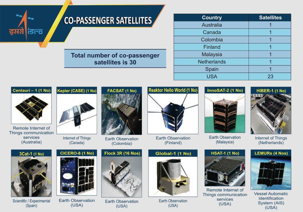 The launch will mark the first from India with satellites for Australia, Colombia, Malaysia and Spain, which join 28 other countries which have launched payloads on Indian rockets.