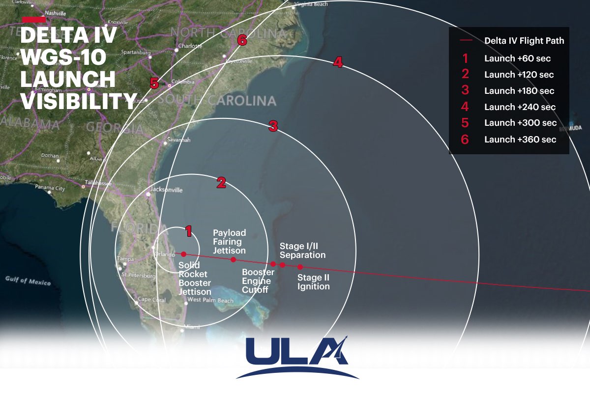 The second stage will perform two firings of its RL10B-2 engine, one for 15 minutes to reach a parking orbit and a second time for three-and-a-half minutes to achieve the targeted super-synchronous transfer orbit to deploy WGS-10. Spacecraft separation is expected 37 minutes after launch.