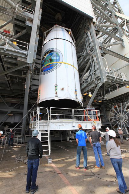 The Delta 4 rocket's payload fairing, containing the U.S. Air Force's WGS 10 communications satellites, is readied for mounting atop the launcher Feb. 26 at Cape Canaveral Air Force Station, Florida. Credit: United Launch Alliance
