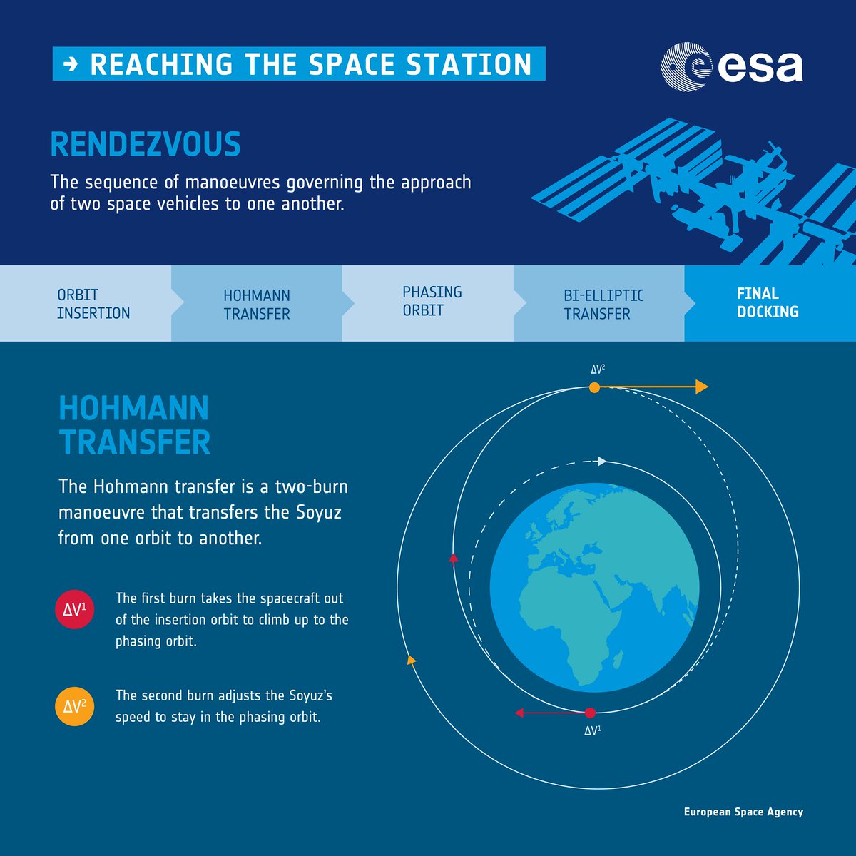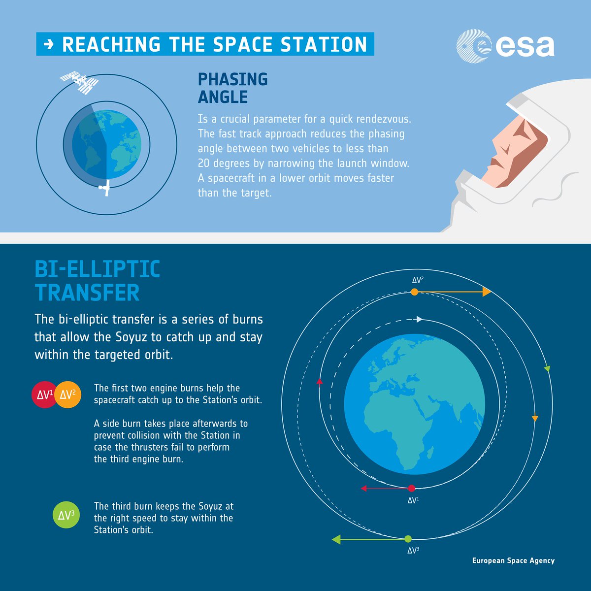 How does @astro_luca get to the @Space_Station? Discover the series of orbital corrections the #Soyuz capsule carries out in these #infographics. The bielliptic transfer to bring the #SoyuzMS13 up to the #ISS's orbit should be underway about now.