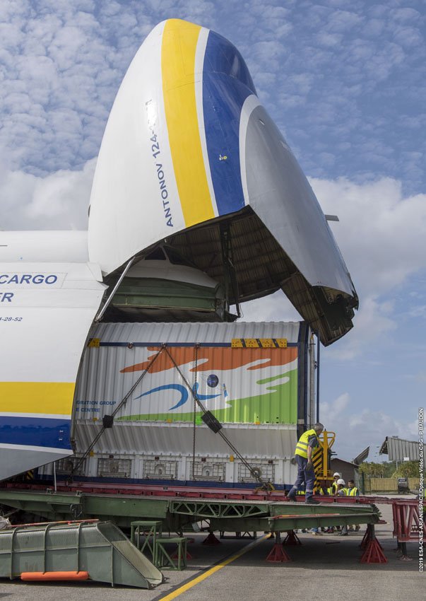 The GSAT-31 passenger for Arianespace Flight VA247 is unloaded from an Antonov An-124 cargo jetliner after arriving in French Guiana (photo at left). A similar process occurred several days earlier with the touchdown of its co-passenger for the upcoming Ariane 5 mission, Saudi Geostationary Satellite 1/Hellas Sat 4 (photo, right).
