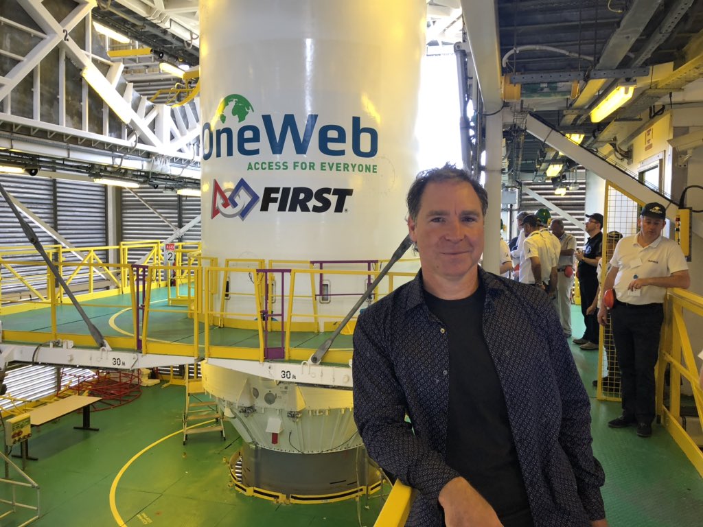 Greg Wyler, OneWeb's founder and chairman, poses with the payload fairing on a Soyuz launcher containing his company's first six broadband satellites. Credit: Greg Wyler