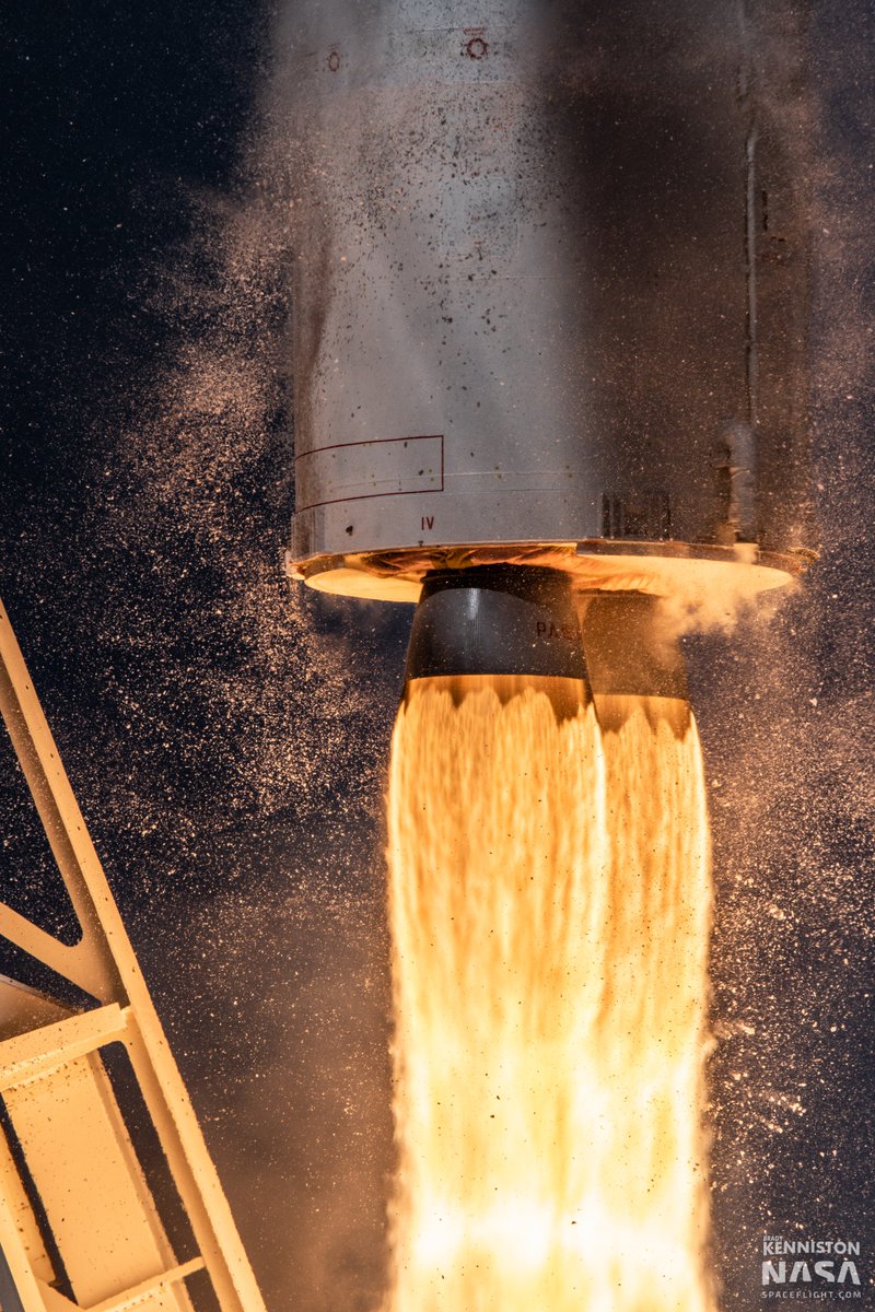 The two-stage launcher quickly rose from the launch pad overlooking the Atlantic Ocean, clearing four lightning masts within seconds as the first stage's hydraulic steering system engaged to direct the rocket toward the southeast, aligning with the flight path of the space station.
