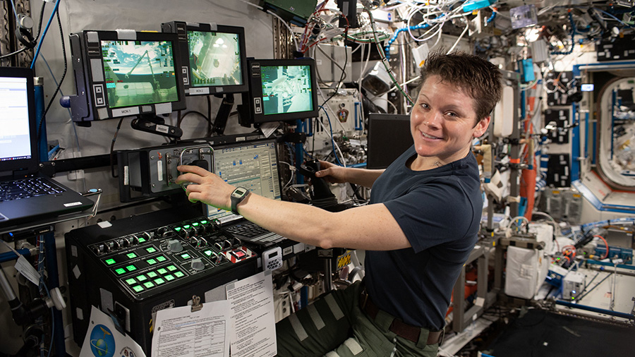 Expedition 59 Flight Engineer Anne McClain of NASA uses the robotics workstation inside the U.S. Destiny laboratory module to practice Canadarm2 robotics maneuvers and Cygnus spacecraft capture techniques.