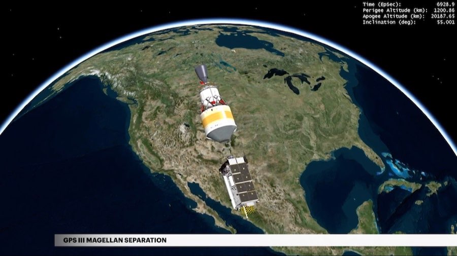 Delta IV successfully deployed the GPS III satellite into its targeted low-inclination orbit, 1200 kilometers above the Earth. From this transfer orbit, Magellan will circularize into its final plane, and slot and proceed into checkout and testing for its first 6 months in space.