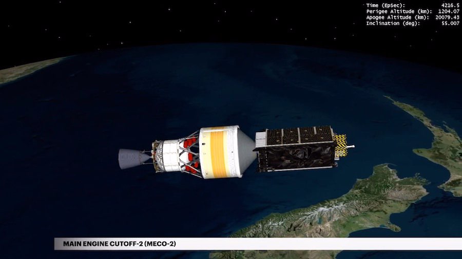 T+plus 1 hour, 49 minutes. After the completion of the primary mission today by deploying the payload, the second stage will perform a third and final burn. Engine start is expected in about 30 minutes. This brief, 15-second firing will serve as a de-orbit burn by lowering the rocket body's perigee for disposal into the atmosphere at the end of this revolution of the globe, which will occur about five hours from now. The disposal guards against unnecessary space debris.
