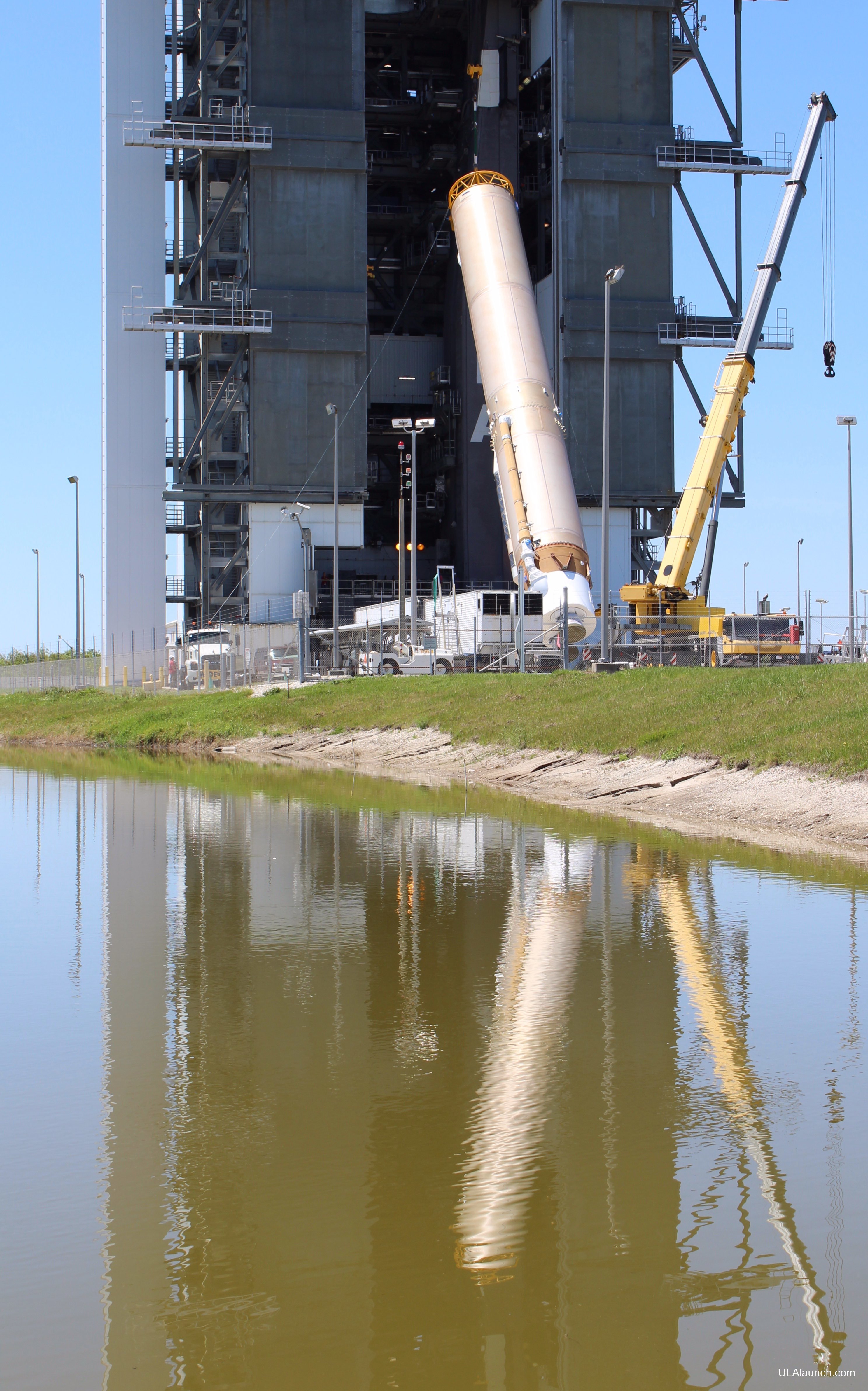 The first stage to launch AEHF-5 is hoisted onto the MLP. Photo: United Launch Alliance