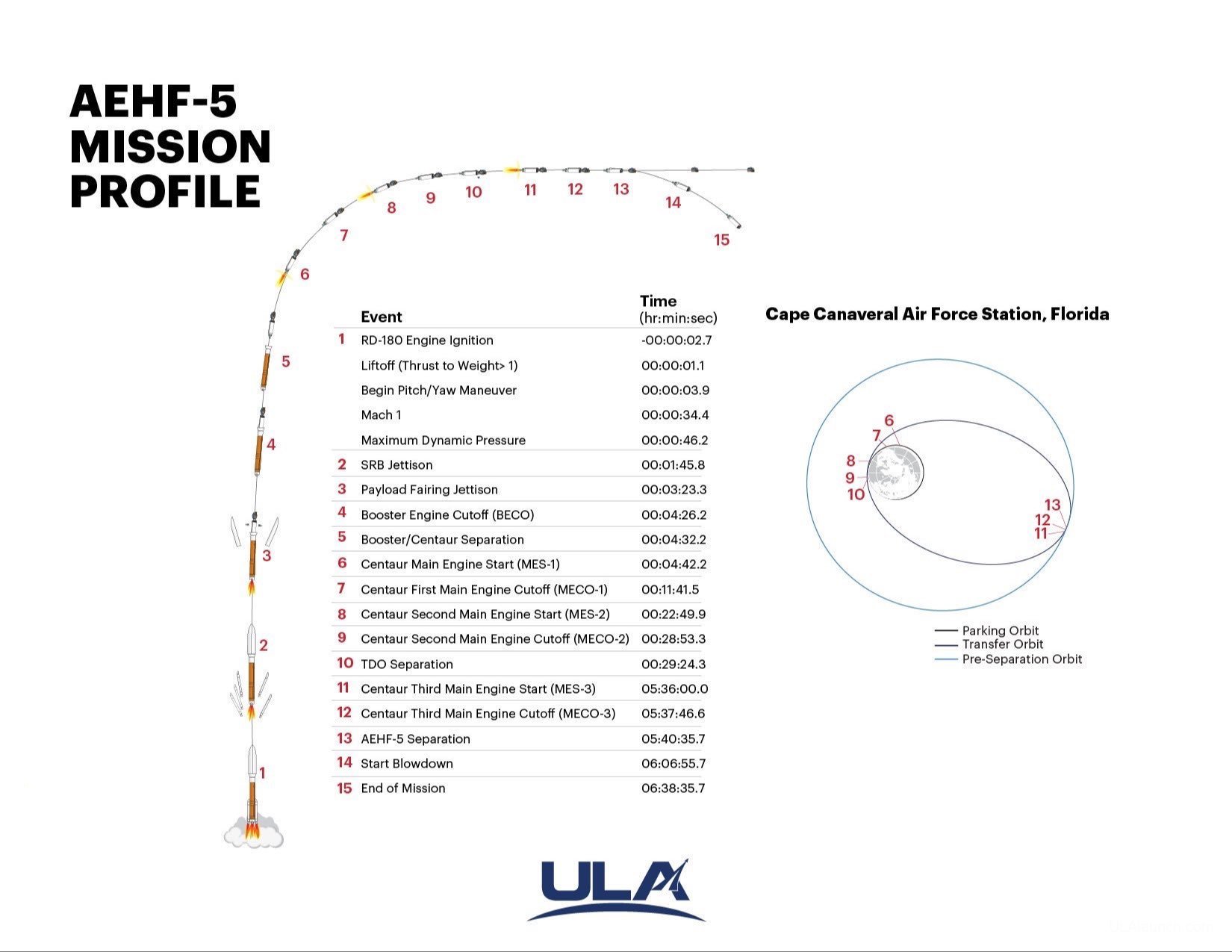 A United Launch Atlas 5 rocket is set to launch the U.S. Air Force's fifth Advanced Extremely High Frequency communications satellite from Cape Canaveral. This timeline shows the major mission events planned over a nearly six-hour flight to an optimized geostationary transfer orbit.[
