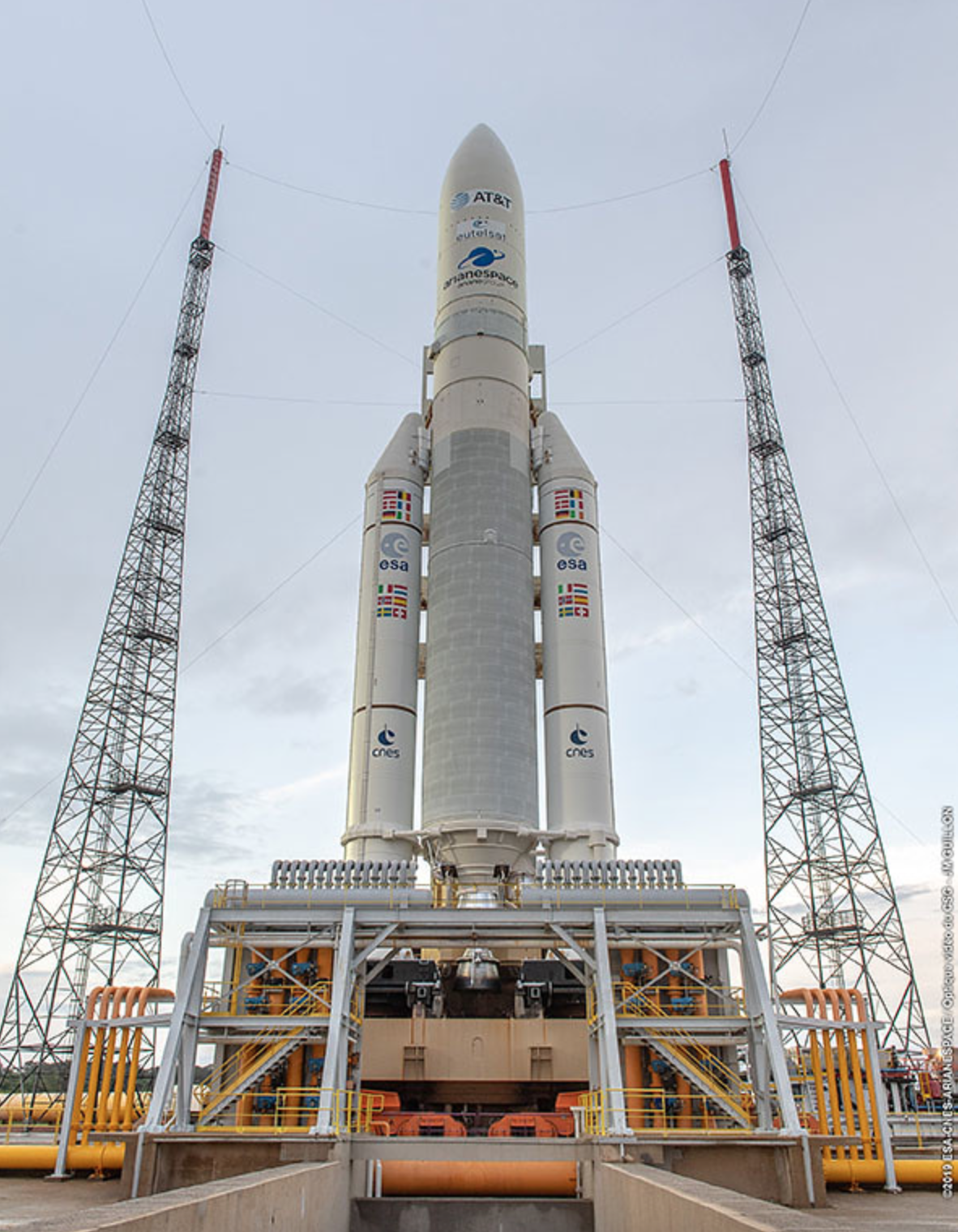 Here's a view of the Ariane 5 rocket on the launch pad yesterday after rollout from the final assembly building.