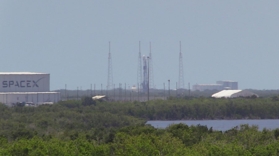 Here's a view of the Falcon 9 rocket vertical at Cape Canaveral's Complex 40 launch pad, as seen from pad 39B at the neighboring Kennedy Space Center.