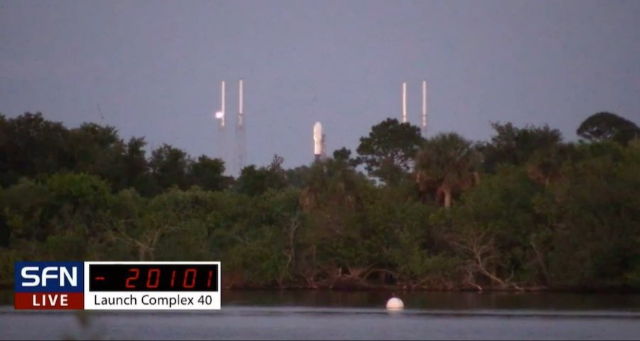T-minus 1 hour, 43 minutes. Good evening from the Kennedy Space Center, a short distance away from the Falcon 9's launch pad at neighboring Cape Canaveral Air Force Station.