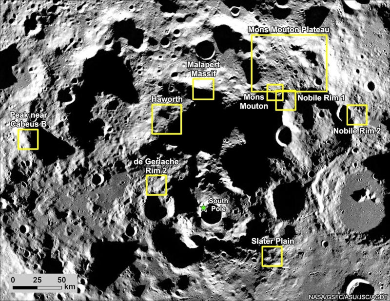 Из присутствовавших ранее в этом списке позиций остались: края кратера Нобиле (Nobile Rim 1 и Nobile Rim 2), край кратера Де Герлах (de Gerlache Rim 2), кратеры Малаперт (Malapert Massif) и Хауорт (Haworth). Из новых значатся: пик возле кратера Кабео (Peak near Cabeus B), плато и гора Монс Мутон (Mons Mouton Plateau и Mons Mouton) и равнина кратера Слейтер (Slater Plain).