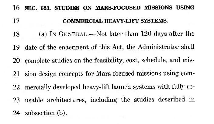 Тем временем в новой версии бюджета, которую Айзекман сенату показывал пункт о том что в течении 120 дней надо предоставить концепты миссии к Марсу с использованием полностью многоразовой тяжелой коммерческой ракеты.