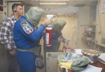 Был отработан и самый худший вариант – когда пожар потушить не удалось. В этом случае экипаж должен срочно покинуть станцию. Поэтому заключительная часть тренировки проходила в зале ТДК «Союз», где отрабатывалось облачение в скафандры «Сокол» при надетом противогазе, далее имитировался срочный спуск на Землю.