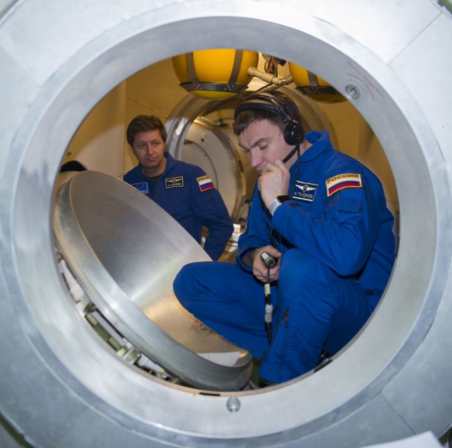Чем ближе дата старта, тем интенсивней и напряжённей становится подготовка основного и дублирующего экипажей МКС-63, для которых началась «горячая пора» зачётов и экзаменов, как теоретических, так и практических. Вчера российские члены основного экипажа МКС-63 Николай Тихонов и Андрей Бабкин сдавали зачётную тренировку по комплексу средств шлюзования и системам скафандра «Орлан-МКС» на тренажёре «Выход-2», уникальность которого заключается в том, что он имитирует работу полётных скафандров «Орлан-МКС» и оборудования шлюзовых отсеков в условиях моделируемой невесомости.