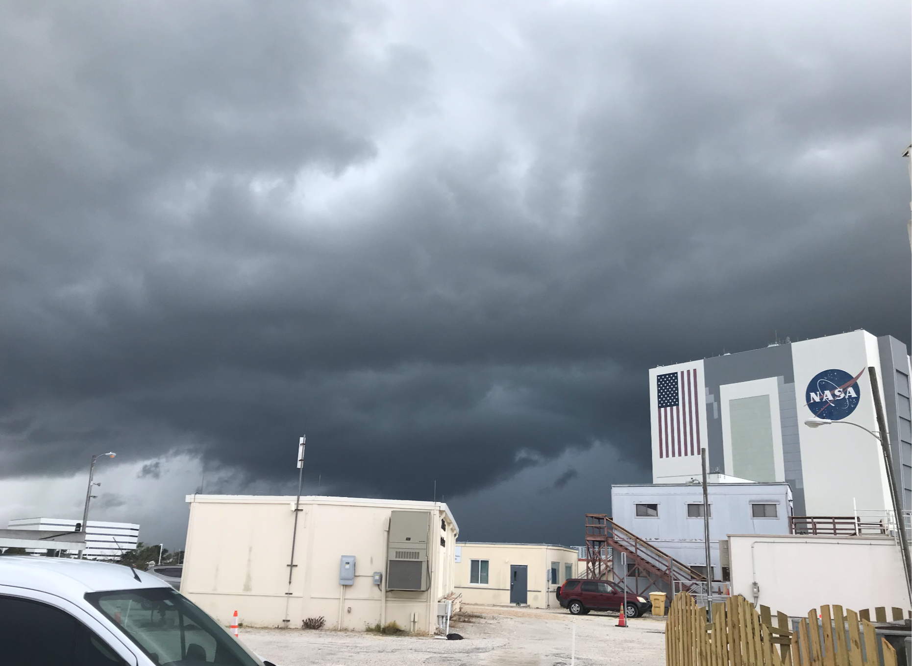 A wave of thunderstorms is passing over the Cape Canaveral area this afternoon, bringing dark clouds, rain and thunder to the Kennedy Space Center. Here's a view from the KSC press site a few minutes ago.