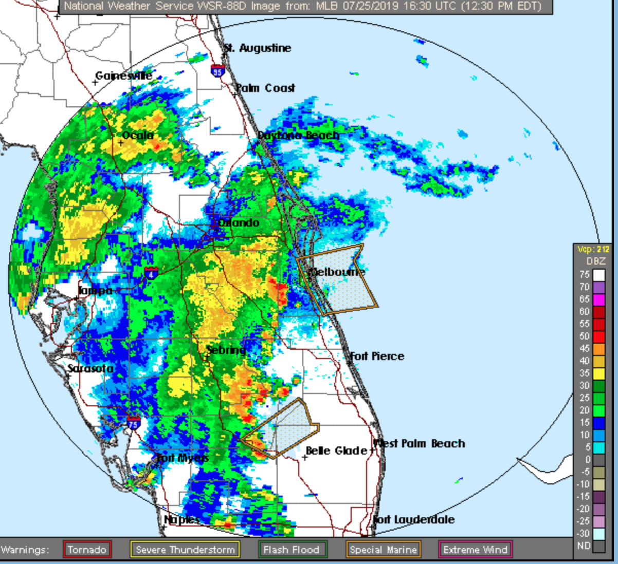 Here's a view of the weather picture over Central Florida, as seen by the National Weather Service's radar in Melbourne at 12:30 p.m. EDT (1630 GMT).