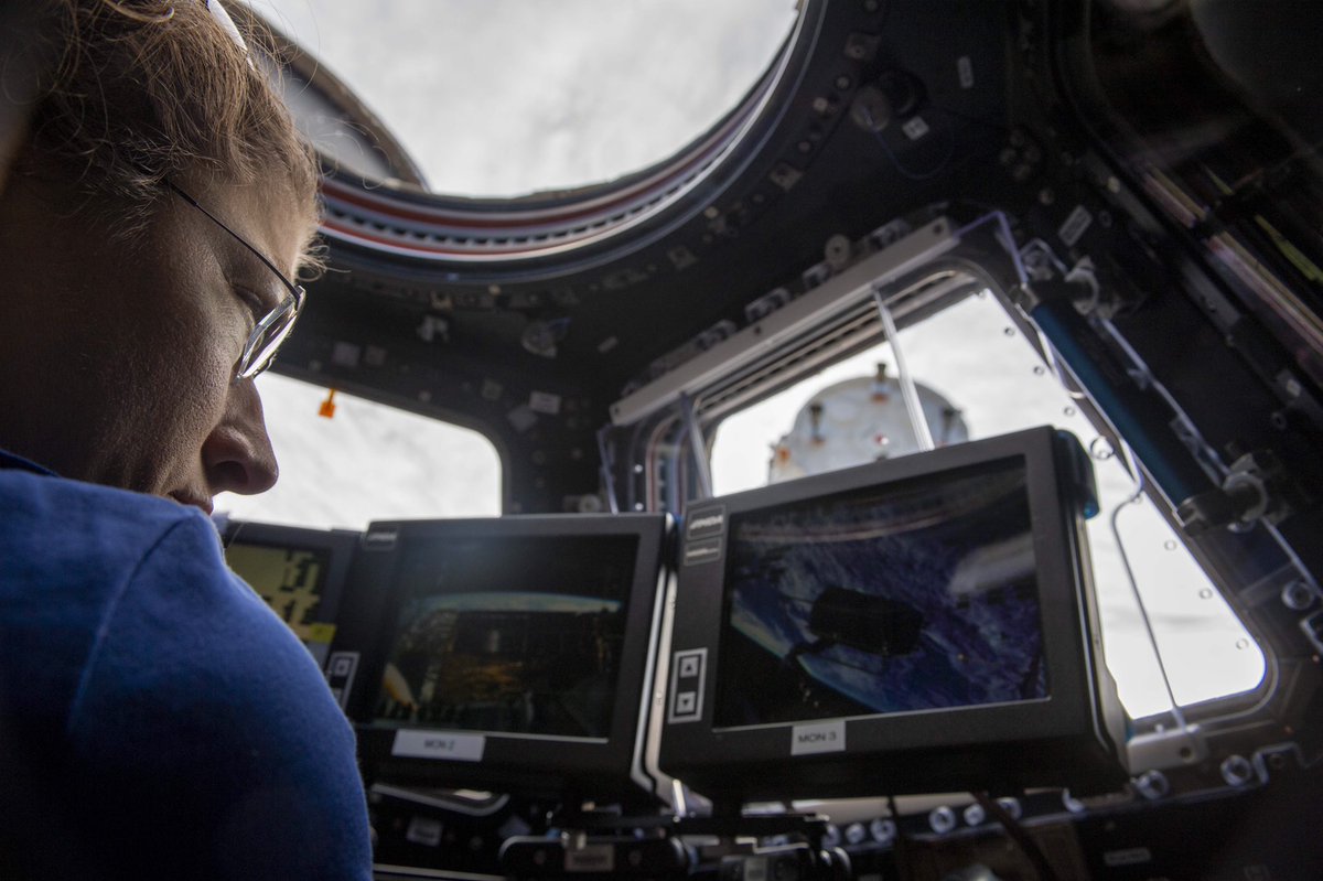 Using the International Space Station's robotic arm, Canadarm2, Expedition 60 Flight Engineer Christina Koch of NASA, backed up by her NASA crewmate Andrew Morgan, operated the station's Canadarm2 robotic arm from the station's cupola to capture the 12-ton spacecraft as it approached from below. Flight Engineer Luca Parmitano of ESA (European Space Agency) monitored HTV-8 systems during its approach to the station.