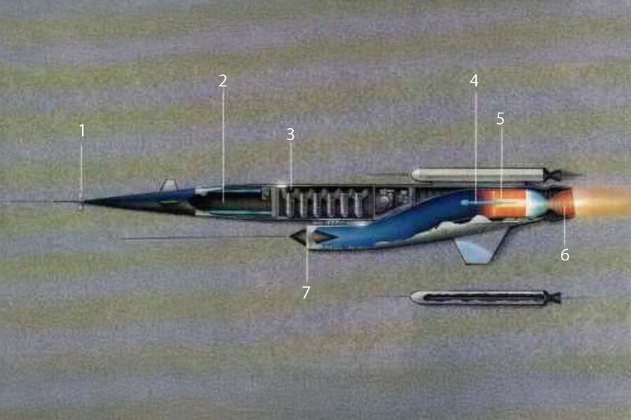 Ракета SLAM в разрезе. 1) Антенна системы TERCOM 2) Блок электроники 3) Набор катапультируемых бомб 4) Система управления реактором 5) Реактор 6) Сопло 7) Воздухозаборник