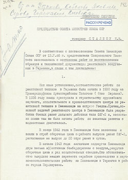 Председателю Совета министров Союза ССР тов. И.В.Сталину Записка Г. Маленкова, Н. Булганина, Д. Устинова, М. Хруничева, Яковлева* и др. об итогах работ по изучению немецкой реактивной техники и восстановлению технической документации.
