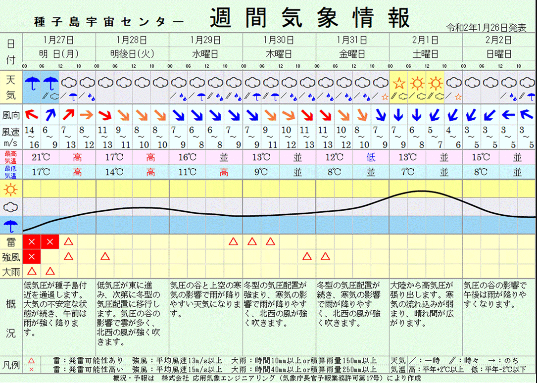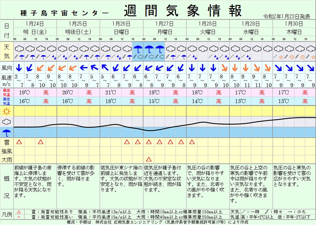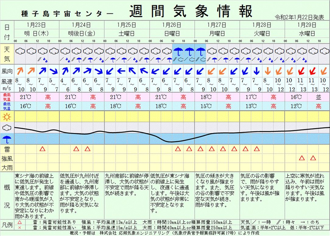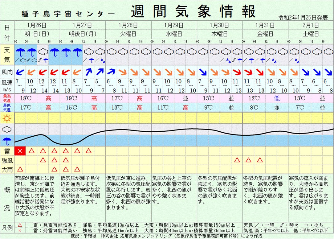 うーん、とりあえずやってみるというには難しい天気ですな。H-IIAロケット41号機打ち上げ見物を予定されている方は、天気予報に注意ですね。http://space.jaxa.jp/tnsc/tn-weather/data/weekly.gif ... (※下は2020/01/22のもの)