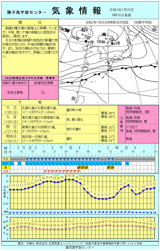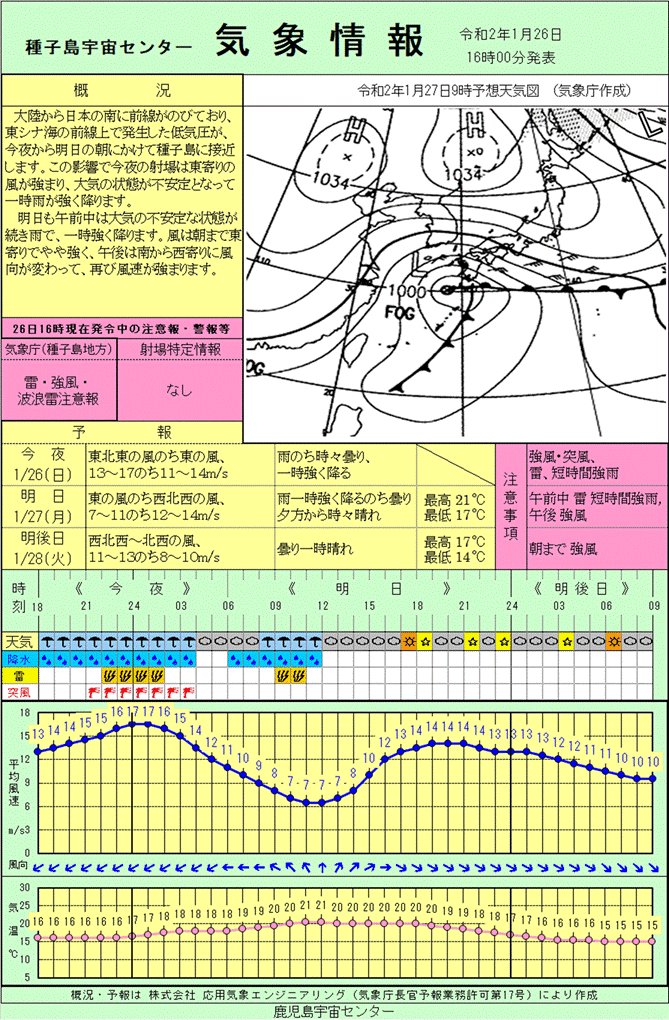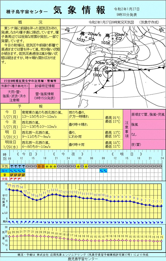 打ち上げ時だけ天気が良ければOKという訳ではなく、準備が可能かということも問題です。機体移動のときの風速がちょいと高そうな予感。http://space.jaxa.jp/tnsc/tn-weather/ ... (※下図は2020/01/27 9:30)