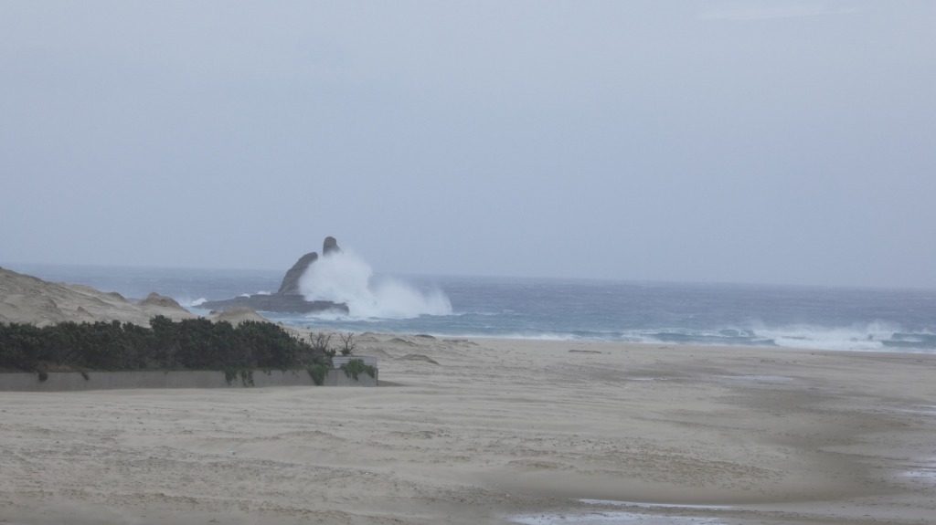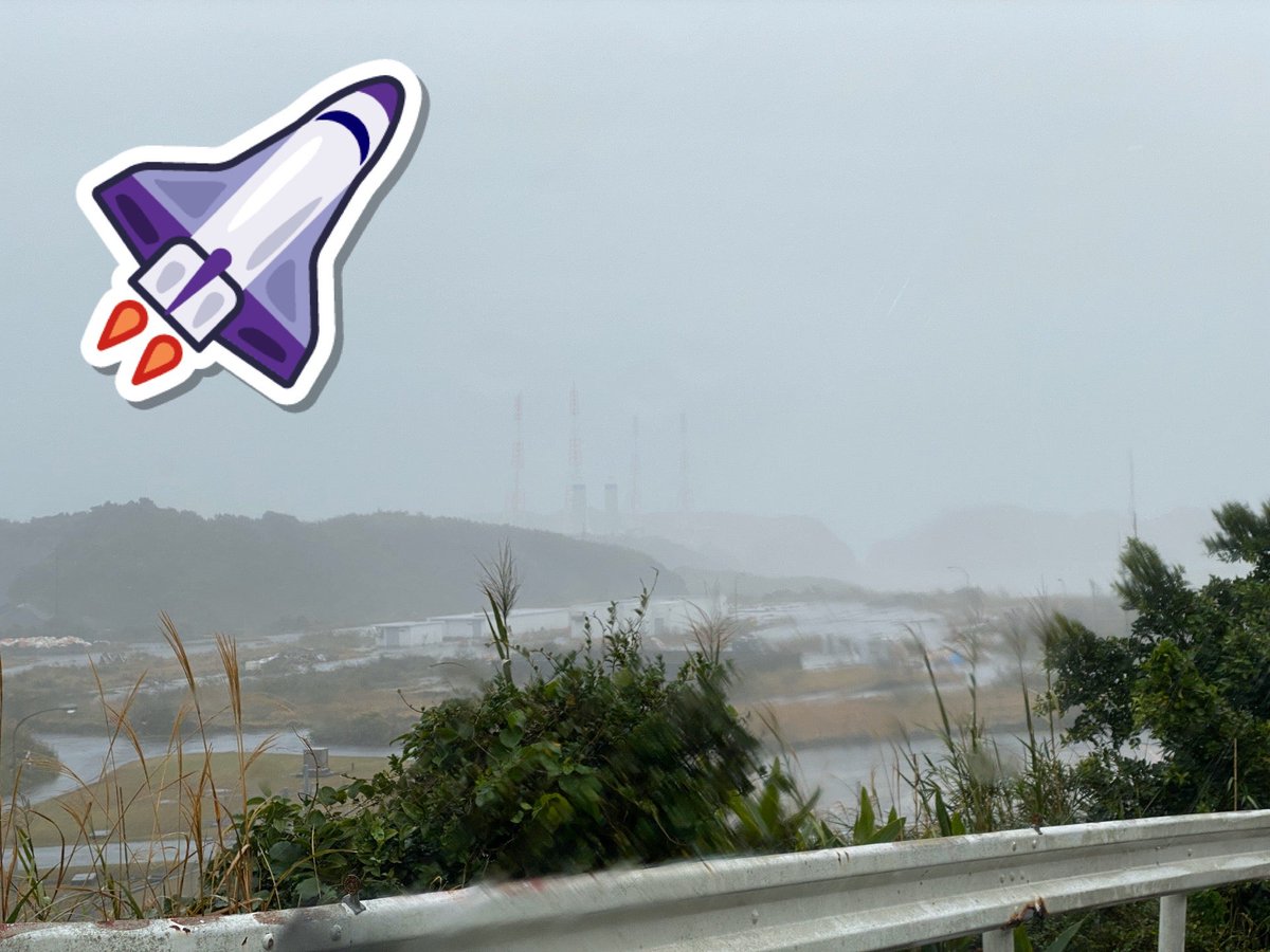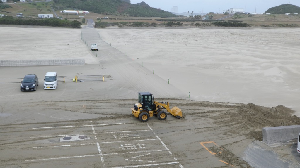 NVS取材班。種子島宇宙センターのプレスルームに入りました。現地は朝方は雷を伴う雨が降っていましたが、午後になって雨は止んできています。ただ、かなり風が強く海は波が高く、報道センターの駐車場は砂に埋まっています。#nvslive #H2AF41