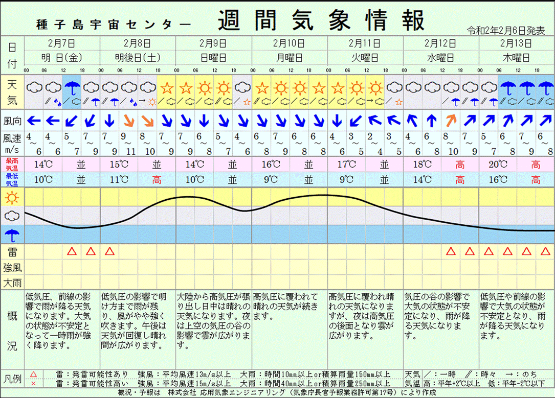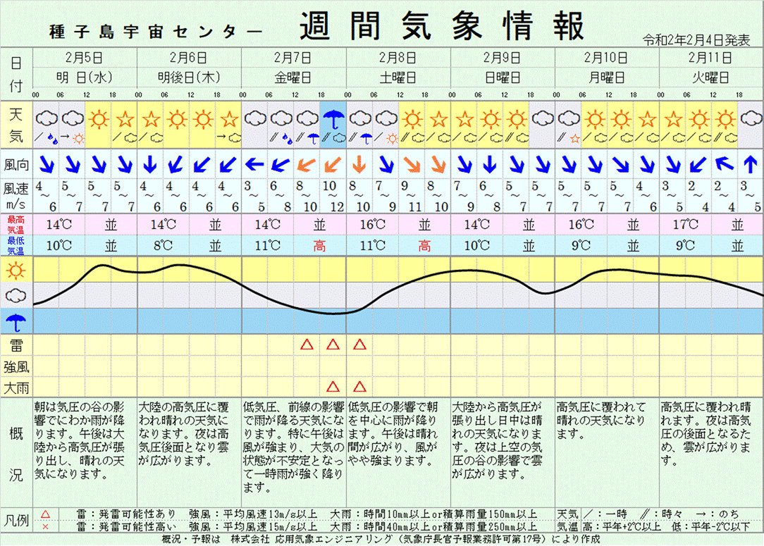 週間予報だと、7日夜の機体移動時間~翌朝の天候が問題になりそうなので、現時点での予報では9日打上げが濃厚?#H2AF41