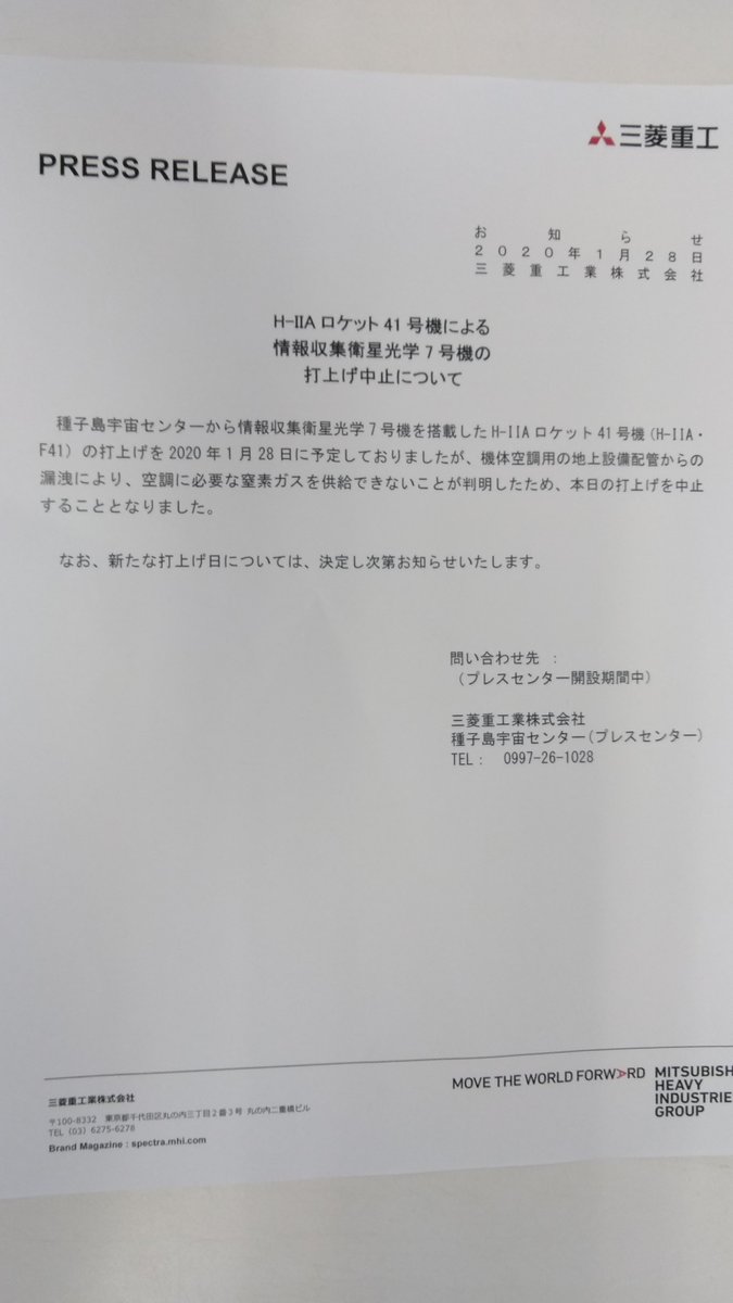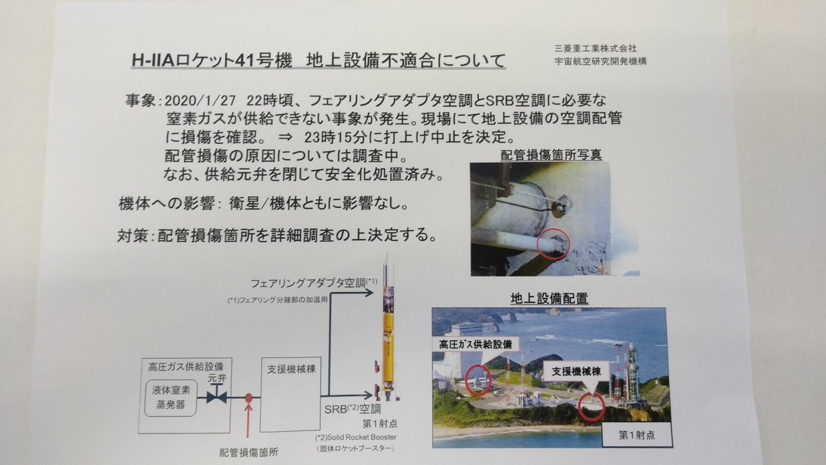 Пуск ракеты-носителя H-IIA № 41 (H-IIA ・ F41) с оптическим спутником сбора информации № 7 (*1) 28 января 2020 года был отложен из-за повреждения трубопроводов наземного оборудования для кондиционирования воздуха.