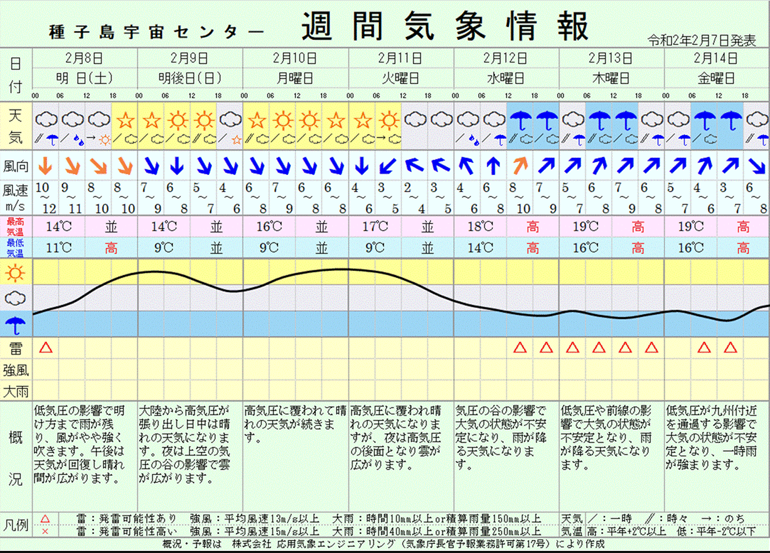 種子島宇宙センターの天気予報をJAXAが発表しております。 打ち上げ日は2月9日。 お天気回復で晴れ傾向のようですね。 http://space.jaxa.jp/tnsc/tn-weather/ ...#nvslive #h2af41