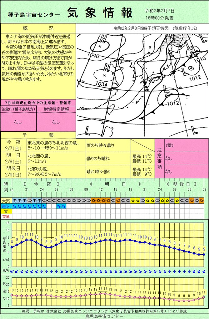 種子島宇宙センターの天気予報をJAXAが発表しております。 9日はお天気回復で晴れ傾向のようですね。