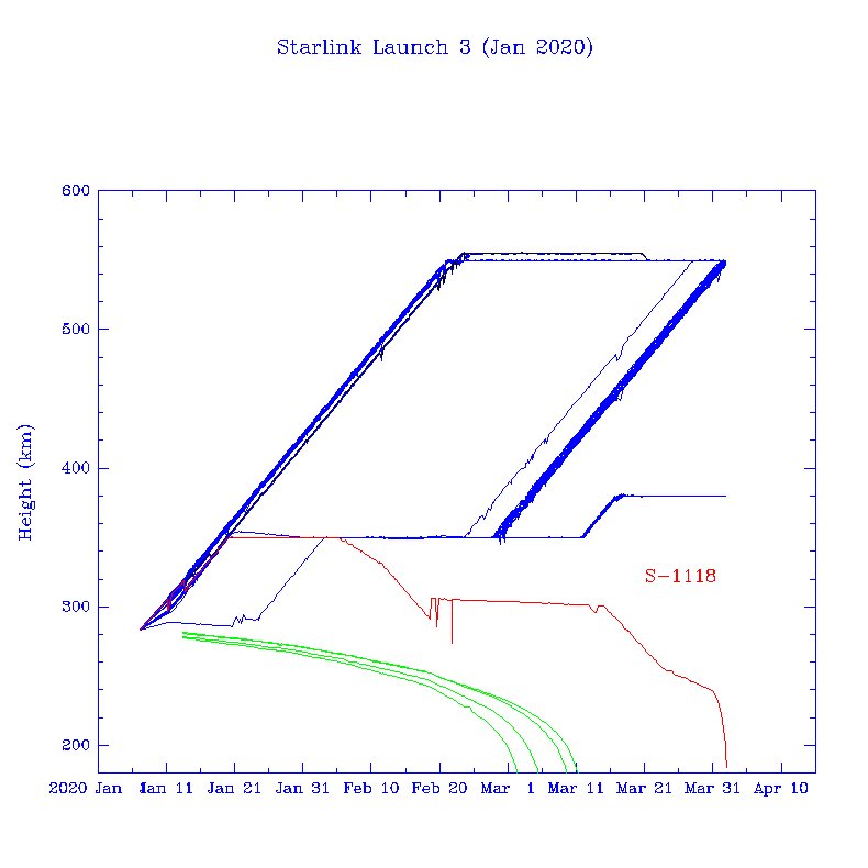 A second Starlink satellite has reentered (358 still in orbit). Starlink-1118 was launched in January,  raised altitude to the 350 km parking orbit, but on Feb 5 lowered itself back down to 300 km and then began orbital decay on Mar 16, with reentry on Apr 2.
