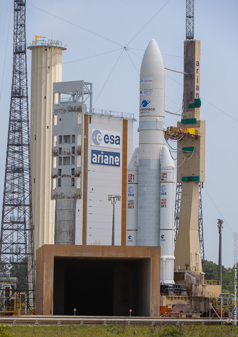 Ariane 5 is in the launch zone for Arianespace's liftoff with JCSAT-17 and GEO-KOMPSAT-2B tomorrow