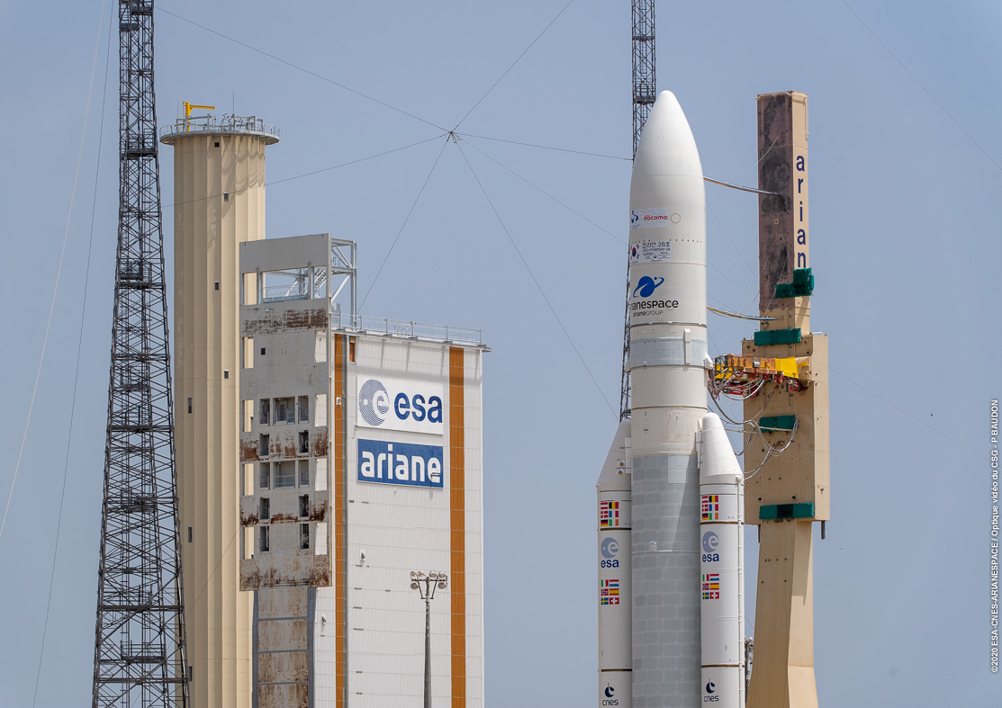 Rollout completed: the Spaceport's ELA-3 launch zone today welcomed the #Ariane5 for #Arianespace's upcoming flight – which will orbit satellites for SKY Perfect JSAT Corporation and @kari2030. #VA252