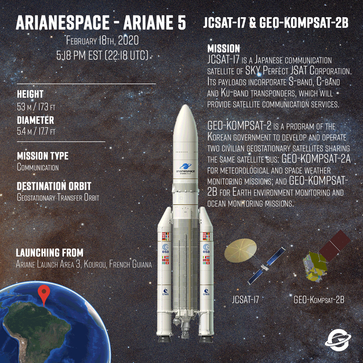 For its third flight of 2020, Arianespace will orbit two telecommunications satellites using an Ariane 5 launch vehicle from the Guiana Space Center: JCSAT 17 for the Japanese operator SKY Perfect JSAT Corporation; and GEO KOMPSAT-2B for Korea Aerospace Research Institute (KARI).