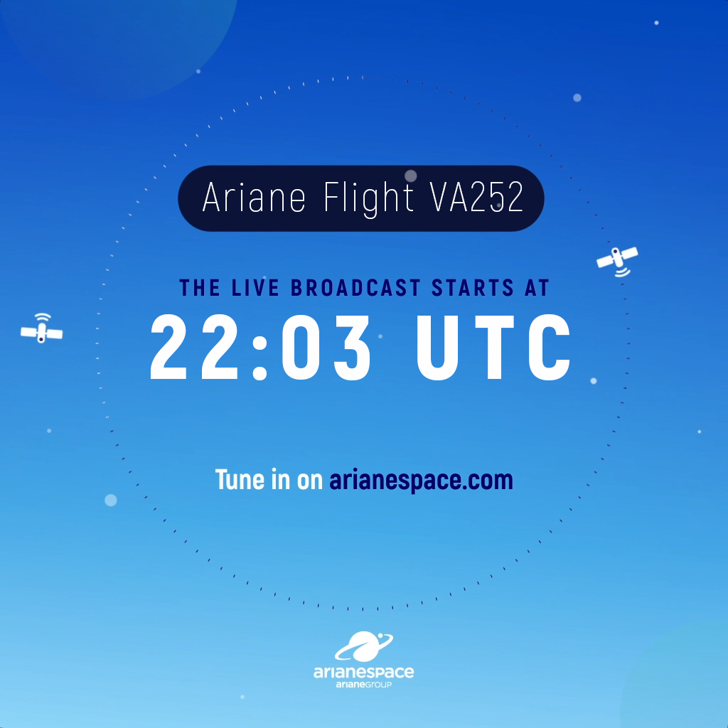 Reminder: the launch broadcast for #Ariane5 Flight #VA252 will begin at 7:03 PM local time in French Guiana (22:03 UTC). You can follow along on http://Arianespace.com and #YouTube.