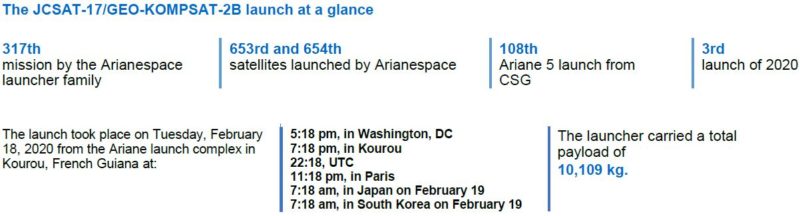 On Tuesday, February 18 at 22:18 UTC (Universal Time Coordinates), Arianespace successfully launched two satellites using an Ariane 5 rocket from the Guiana Space Center (CSG), Europe's Spaceport in French Guiana (South America): JCSAT-17 for the Japanese operator SKY Perfect JSAT Corporation, and GEO-KOMPSAT-2B for the Korea Aerospace Research Institute (KARI).