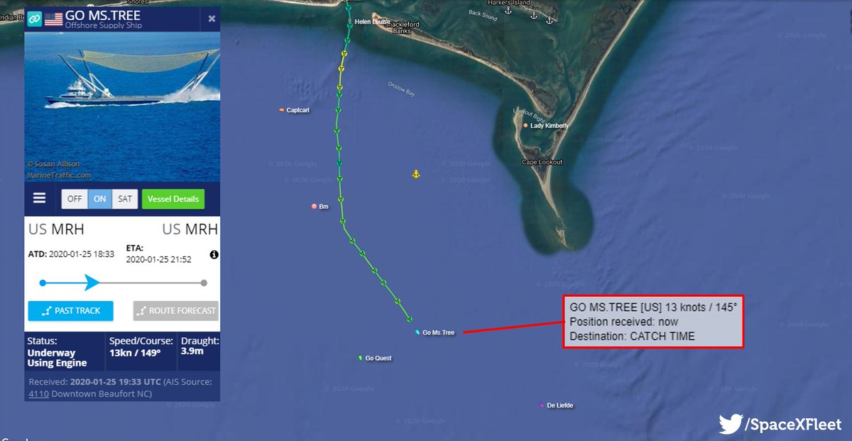 Ms. Tree and Ms. Chief have departed from the Port of Morehead City. The duo will perform their second-ever double catch attempt during the Starlink L3 mission.
