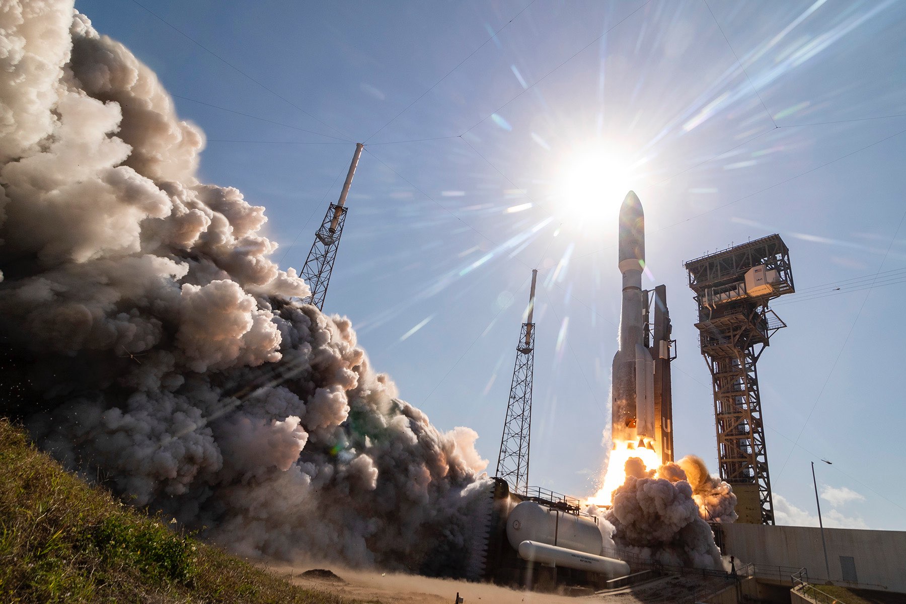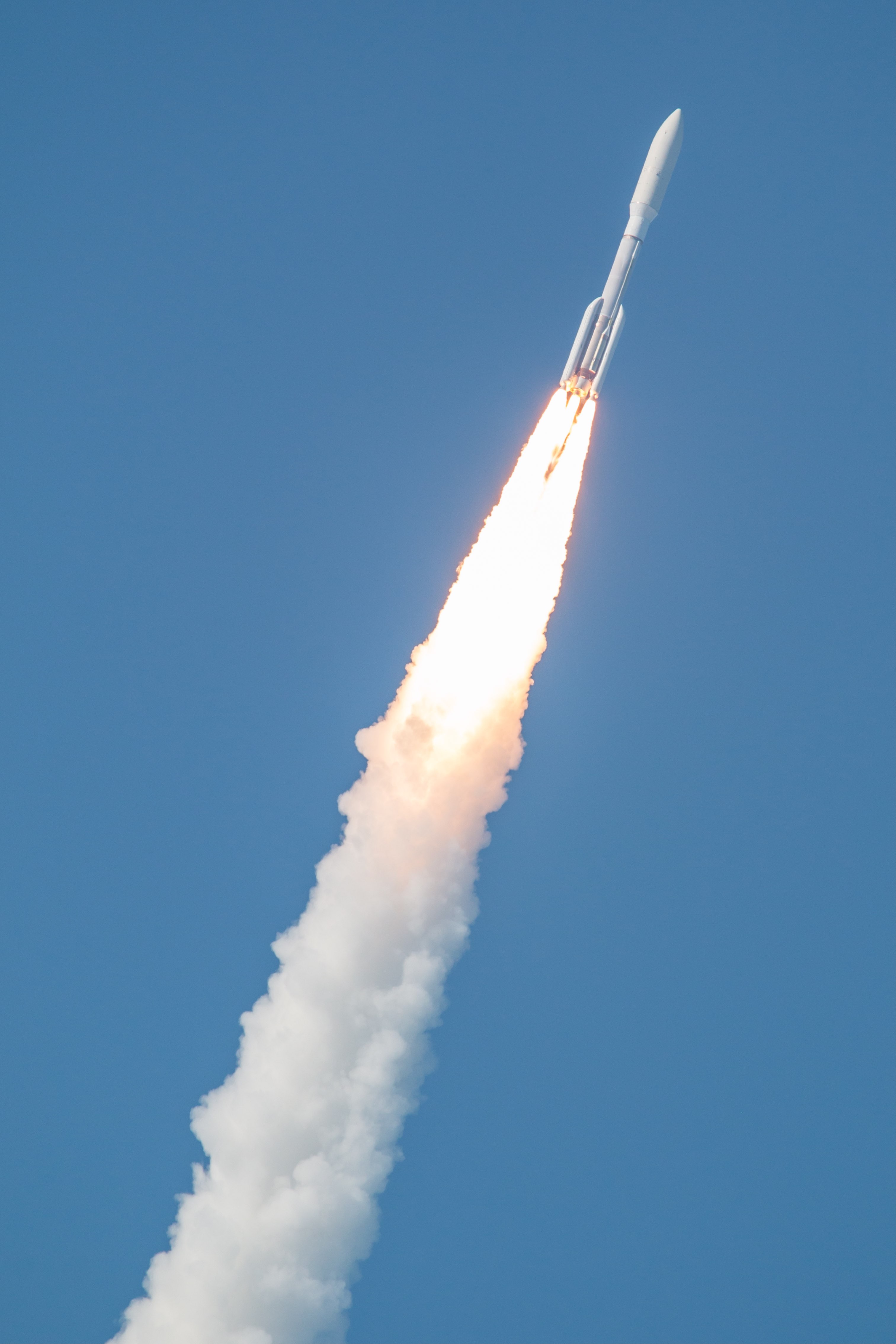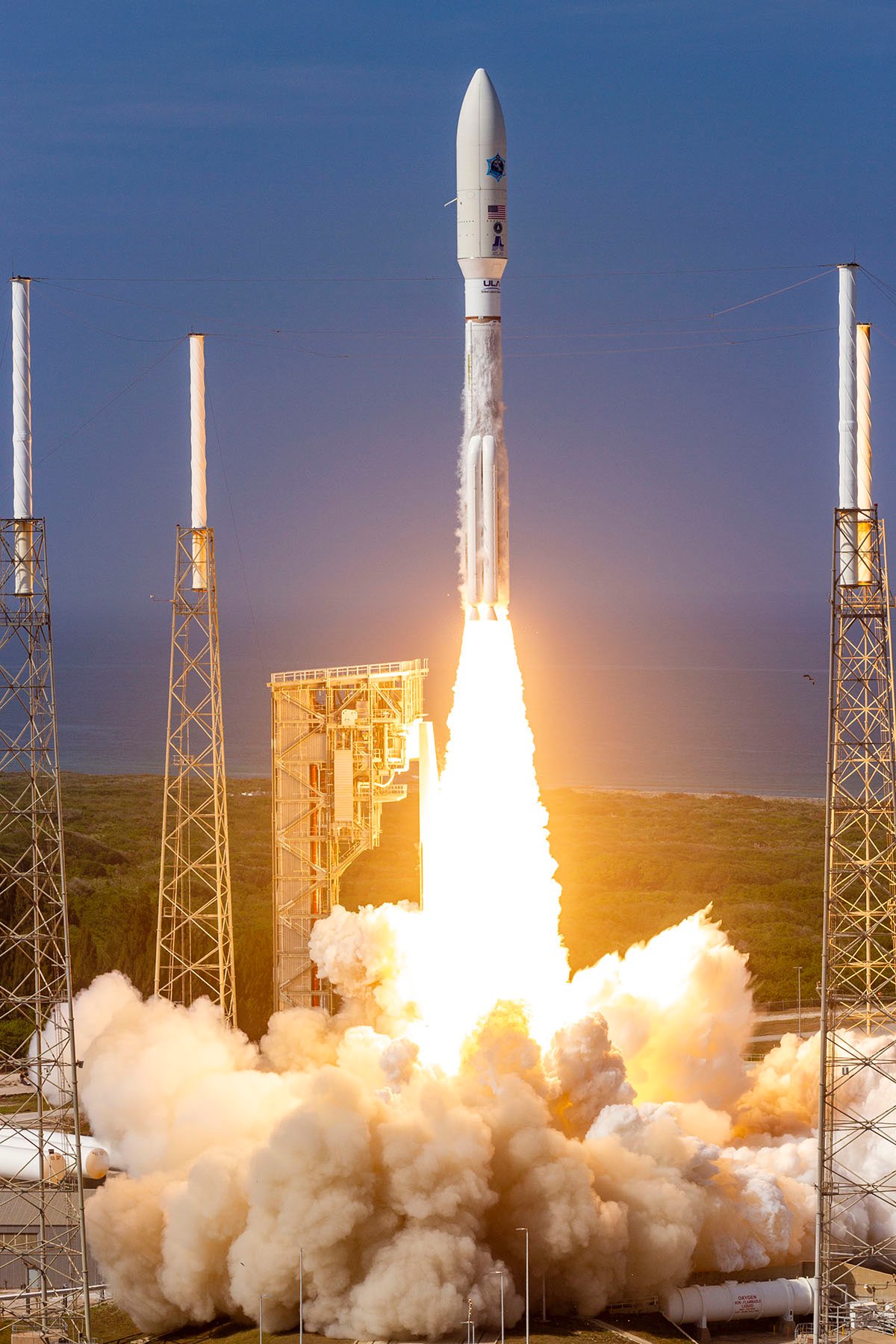 Feel the heat! The ULA Atlas V 551 leaves the launch pad on 2.6 million pounds of thrust from its kerosene-fueled main engine and five side-mounted solid rocket boosters.