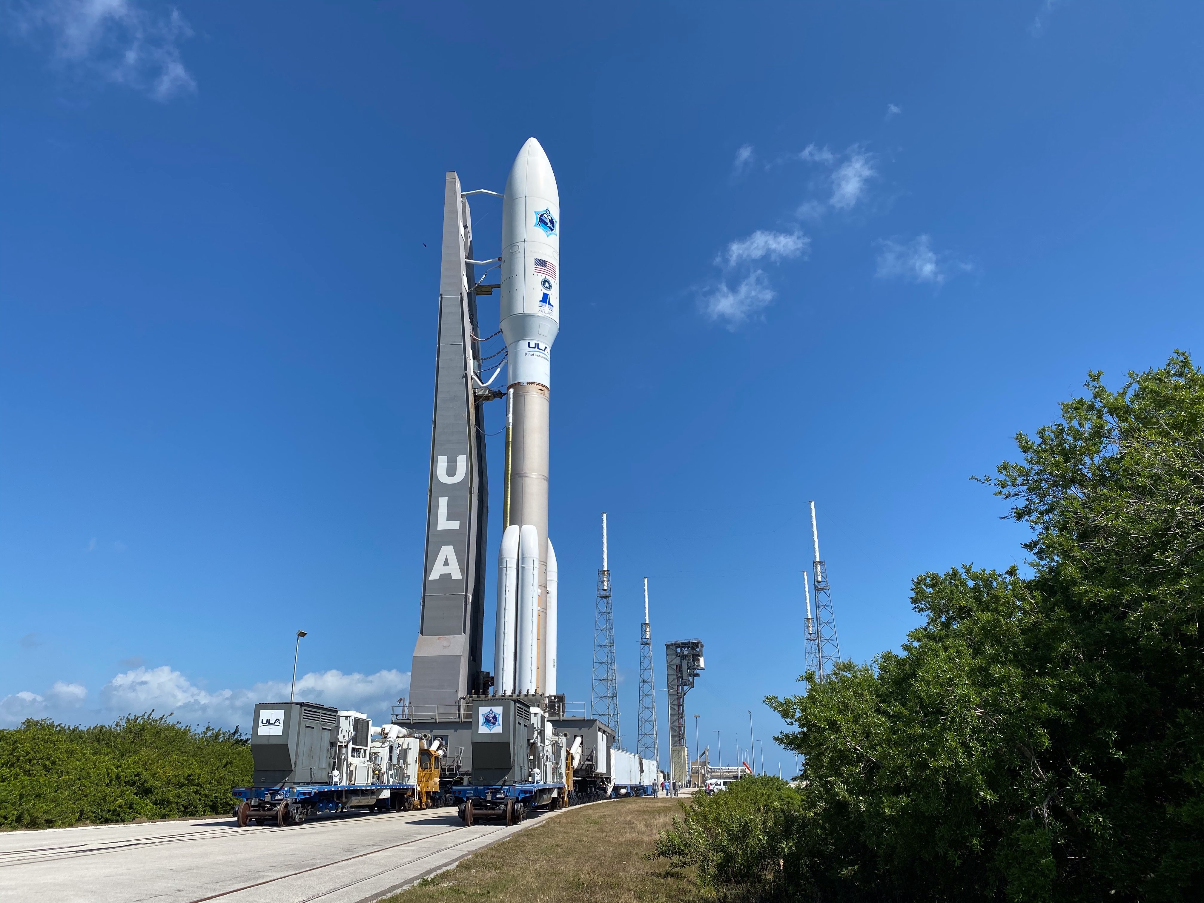 The Atlas V 551 configuration vehicle includes a 5-meter large Payload Fairing (PLF) and stands at 197 ft. tall. The Atlas booster for this mission is powered by the RD AMROSS RD-180 engine. Aerojet Rocketdyne provided the five AJ-60A solid rocket boosters (SRBs) and RL10C-1 engine for the Centaur upper stage.
