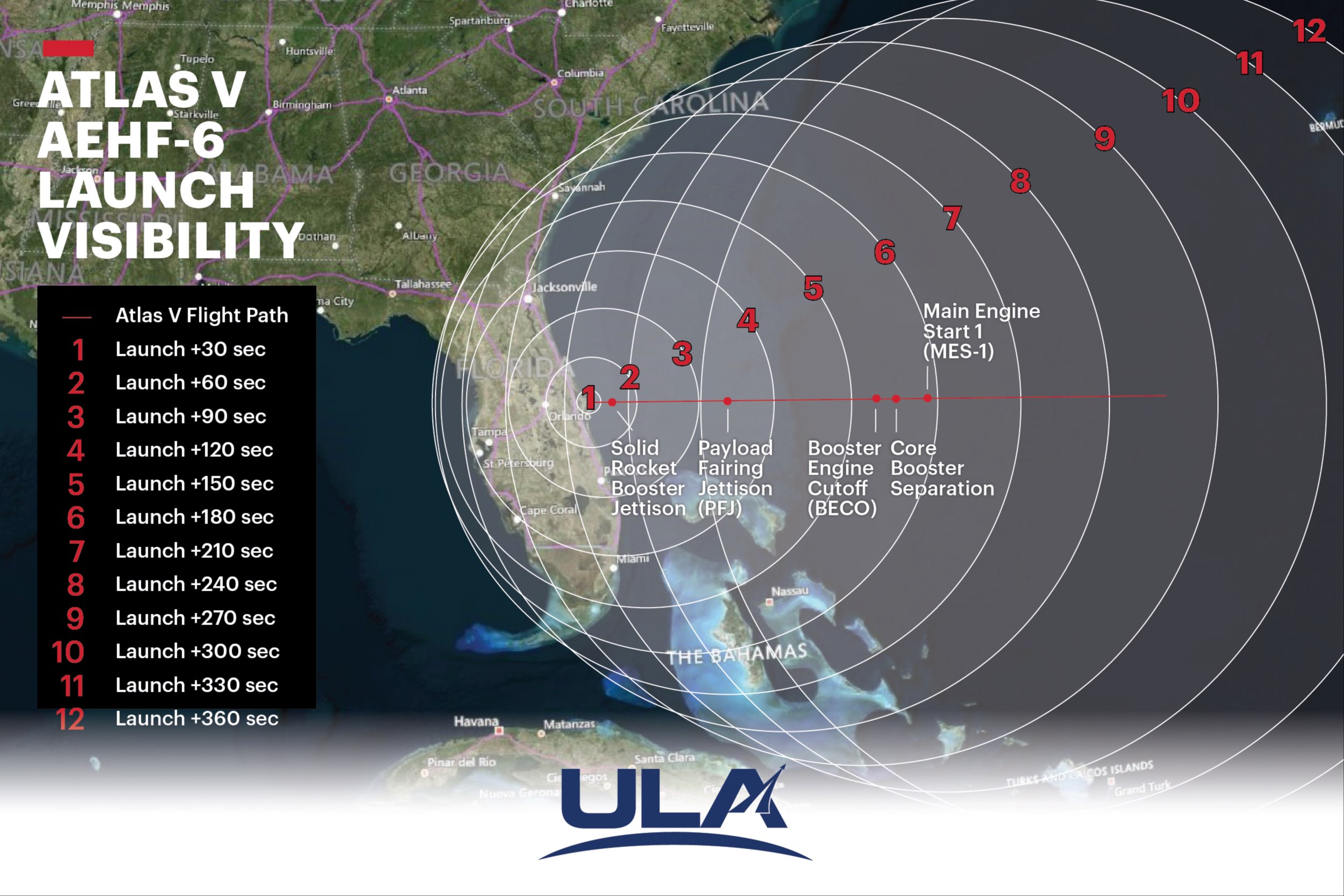 Wondering when and where you may see the Atlas V launch of the AEHF-6 satellite? This visibility map shows when and where your best chances are to see the rocket in the Southeastern U.S.! Launch is scheduled for Thursday at 2:57 p.m. EDT from Cape Canaveral.